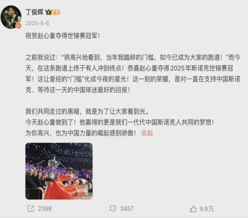 復出后,趙心童從業(yè)余球員重新開始。在克魯斯堡,趙心童從資格賽打起,連續(xù)贏下9場比賽,累計贏下111局?,創(chuàng)下世錦賽奪冠史上最多勝局紀錄。丁俊暉賽后發(fā)文祝賀:當年他踏碎的門檻,已成為大家的跑道,如今終于有人沖到了終點。